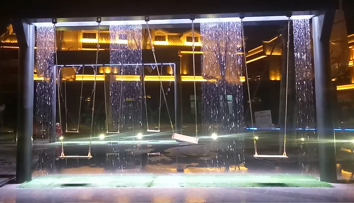 水簾噴泉是水體沿著特殊的線流動(dòng),由于水孔較細(xì)小、單薄,流下時(shí)仿若水的簾幕,構(gòu)成了無聲的閃爍水幕,而流水不會(huì)噴灑到四周,并使空氣變濕潤,可以在室內(nèi)起到觀賞、間隔空間、配合室內(nèi)設(shè)計(jì)的作用,水簾通 過人工對(duì)水流的控制達(dá)到藝術(shù)效果,滿足人的親水要求。