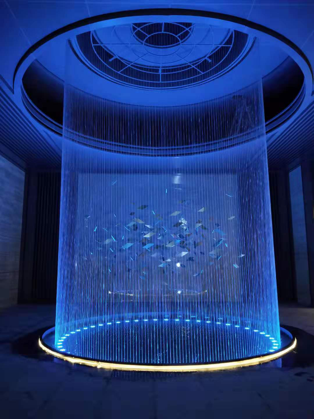 設(shè)備(包括:泵、流溢排水溝、清水加注器、供電電源裝置、線泉傳導(dǎo)板和水下燈飾)以及一個(gè)位于頂部的配水箱(包括:帶有相同數(shù)量的可調(diào)節(jié)的出水口的配水管,聚脂線水簾是透明的、幾乎沒有彈性的線,有規(guī)定的直徑和很高的抗拉強(qiáng)度。